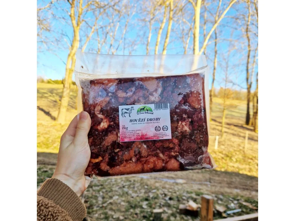 Složení: Hovězí droby 100% (hovězí játra 40%, hovězí plíce 20%, hovězí vemeno 20%, hovězí srdce 15%, hovězí ledviny 5%)